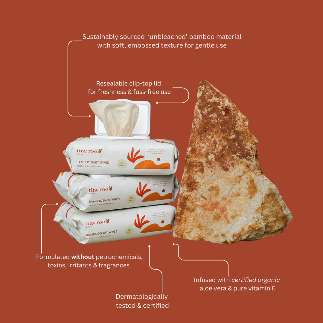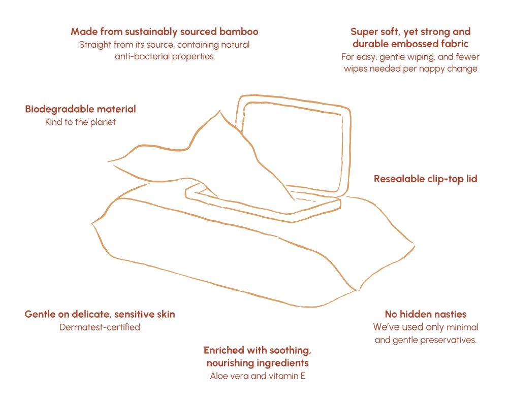 Soft, 'unbleached' bamboo baby wipes with manually pressed embossed pattern for easy and gentle wiping. Developed using kind, honest ingredients, perfect for keeping your little ones skin soft, nourished and protected. High-quality materials, dermatologically tested & certified with DERMATEST® and crafted from sustainably sourced, biodegradable bamboo fibers.